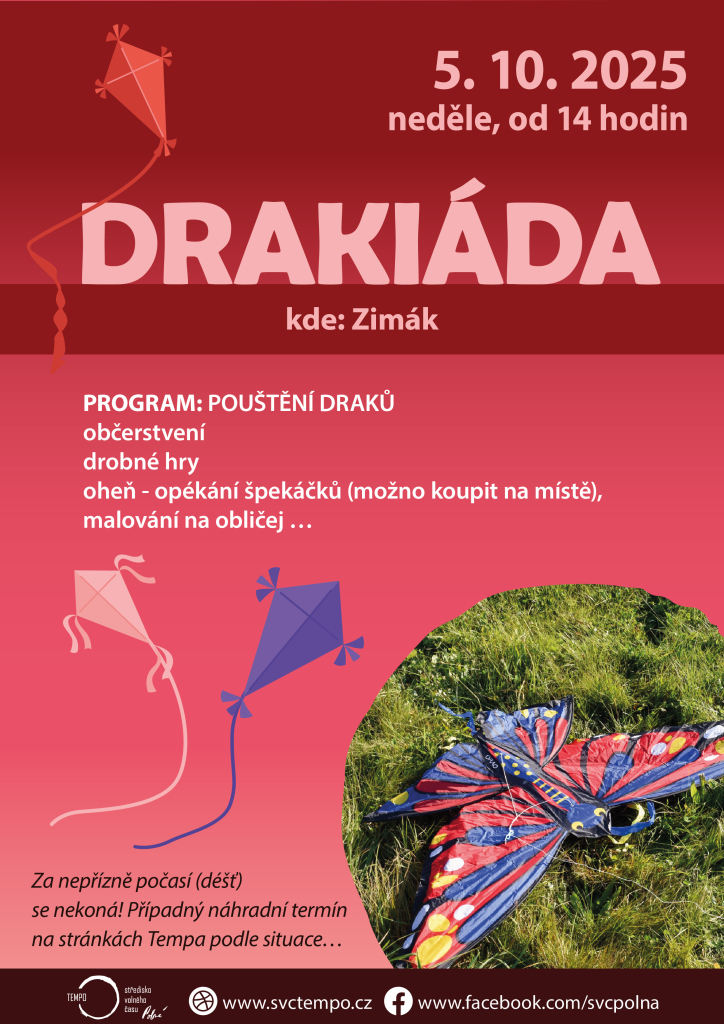 Vezměte draky a domácí mazlíčky a vypravte se zalítat si. K dispozici bude bufet, špekáčky a koutek soutěží. Chybět nebude ani malování na obličej, dračí omalovánky. Doufejme, že bude větrno a polenskou oblohu ozdobí barevný rej draků. Přijďte si užít posledních dnů babího léta, posedět u ohně, poklábosit anebo pobýt s přáteli jen tak.