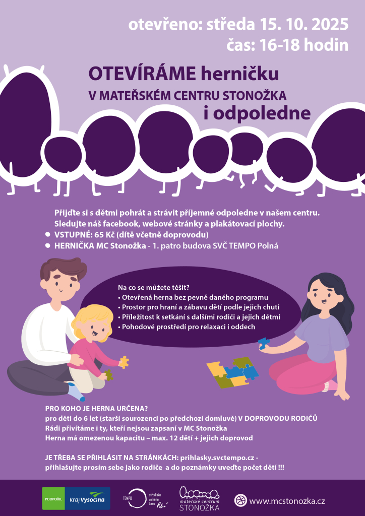 pro děti do 6 let V DOPROVODU RODIČŮ. Navštívit nás mohou i děti, které nejsou přihlášené do MC Stonožka.