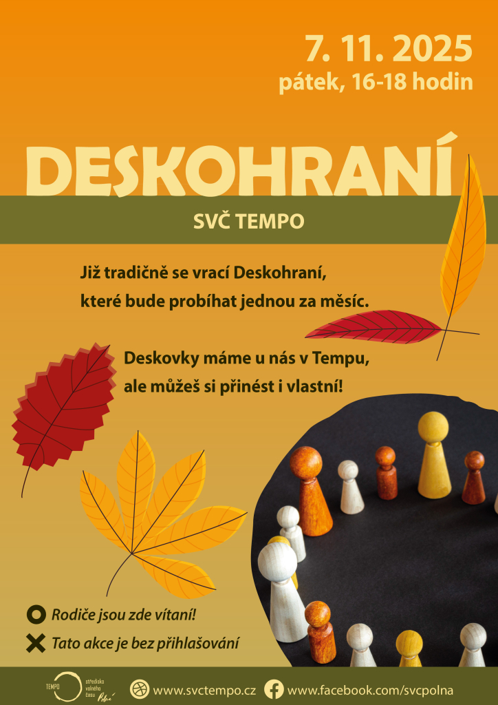 Deskovky máme u nás v TEMPU, ale můžeš si přinést i vlastní.