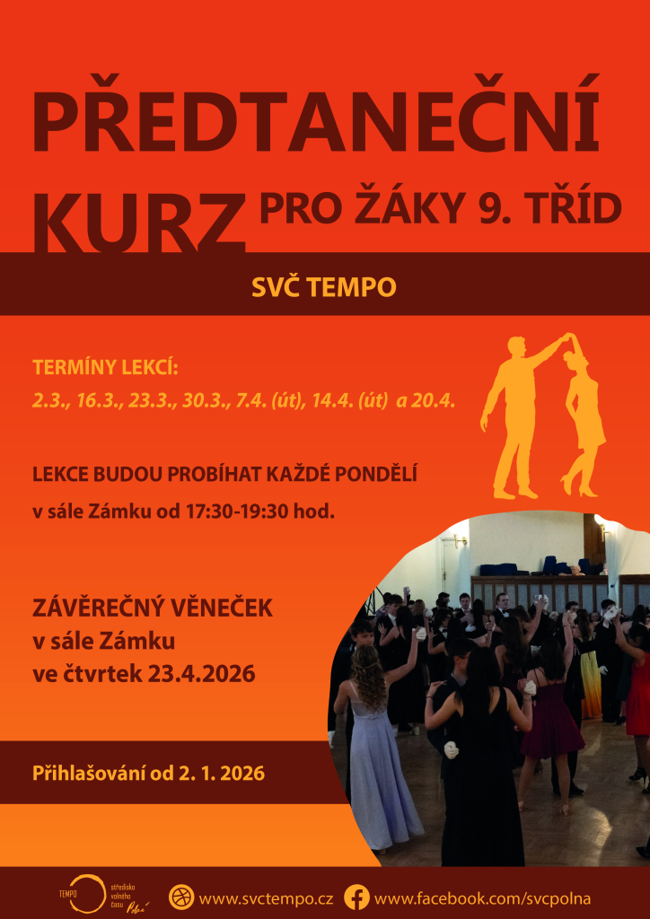 Jednotlivé lekce budou probíhat od 2.3.2026 do 20.4.2026. Kurz bude zakončen závěrečným Věnečkem 23.4.2026 v sále polenského Zámku.