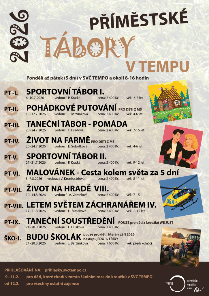 Nabídka táborů je kompletní a přihlašování na příměstské tábory spustíme v pondělí 9.2.2026 od 16 hodin.