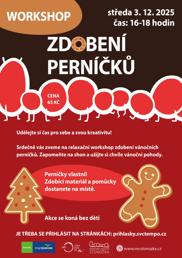 Přijďte si vyzkoušet zdobení medových perníčků trochu jinak, vyměnit si zkušenosti s recepty a nasát vánoční náladu v pohodovém prostředí našeho mateřského centra.